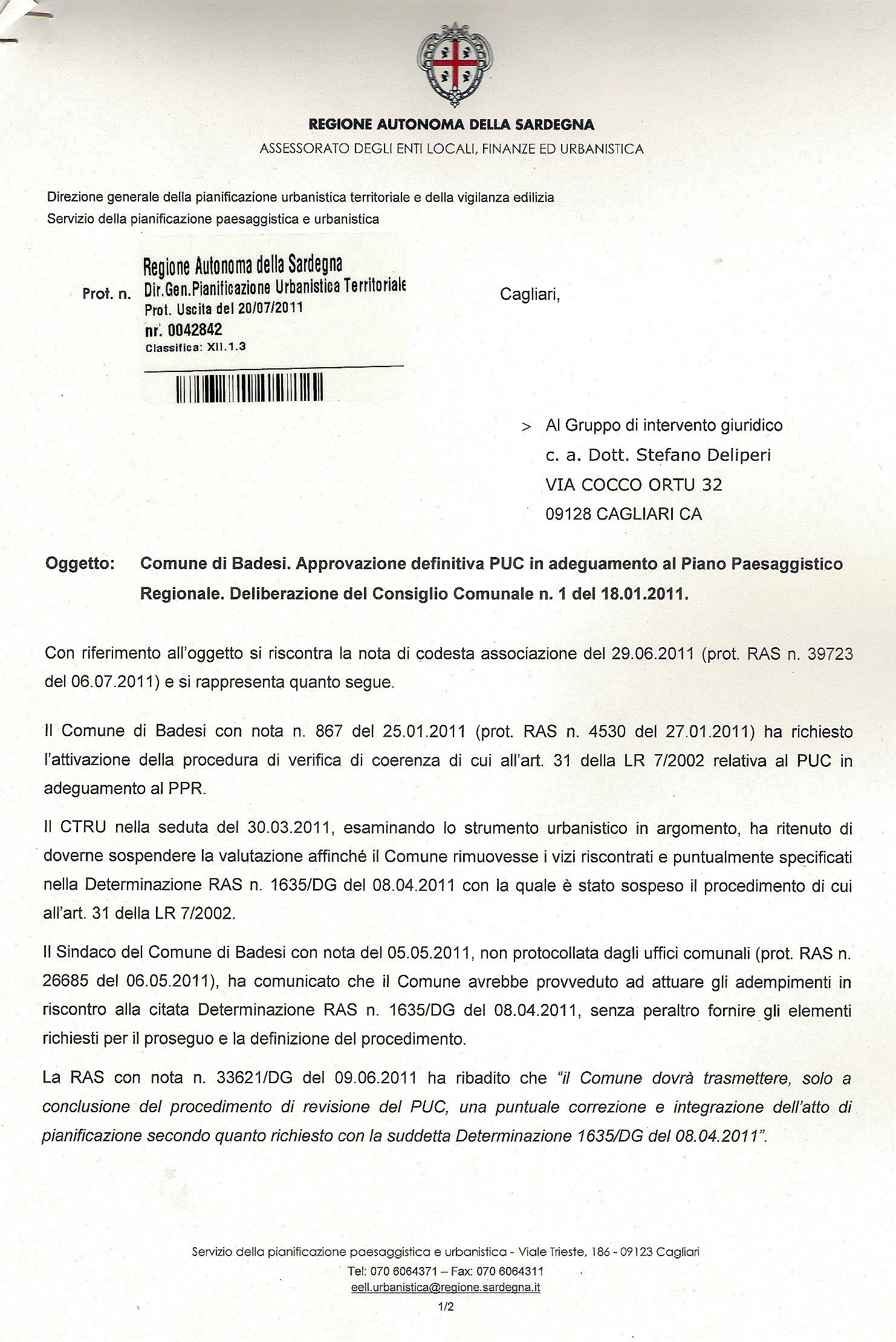 Pubblichiamo, allora, la comunicazione (nota n. 42842 del 20 luglio 2011) pervenuta dalla Regione autonoma della Sardegna – Servizio della pianificazione paesaggistica e urbanistica (Direzione generale della Pianificazione urbanistico territoriale dell’Assessorato regionale degli EE.LL., Finanze, Urbanistica), uno stralcio – relativo all’aeroporto o aviosuperficie che dir si voglia – della determinazione n. 1635 dell’8 aprile 2011 con cui la Direzione regionale della Pianificazione urbanistico territoriale dell’Assessorato degli EE.LL., Finanze, Urbanistica della Regione autonoma della Sardegna ha richiesto al Comune di Badesi una serie di modifiche sostanziali e radicali al P.U.C. approvato e, infine, la nota n.33621/DG del 9 giugno 2011 con cui la Direzione regionale della Pianificazione urbanistico territoriale dell’Assessorato degli EE.LL., Finanze, Urbanistica della Regione autonoma della Sardegna ha ricordato al Comune di Badesi come si può ottenere un P.U.C. realmente legittimo e valido. Leggi tutto…