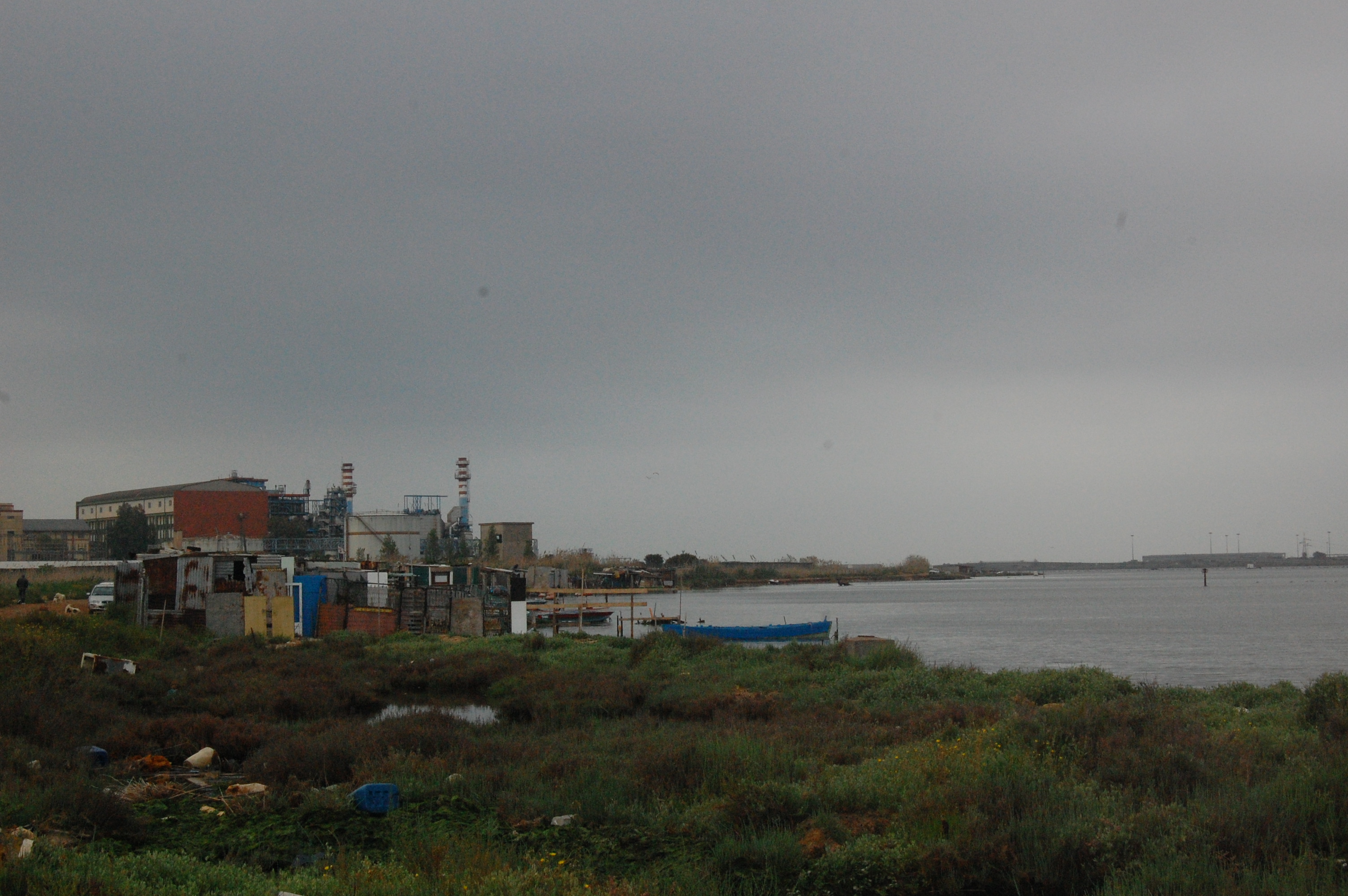 Cagliari, S. Gilla, presenza di baracche in metallo, legname ed eternit. Sullo sfondo la centrale ENEL