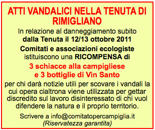In seguito ai gravi atti vandalici accaduti lo scorso 13 ottobre 2011 nella Tenuta di Rimigliano (San Vincenzo, LI), la Società titolare dell’area ha ritenuto di stabilire una taglia di 30.000 euro in favore di chi fornirà elementi utili all’individuazione dei responsabili. Come nel Far West.