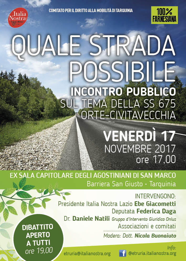 Venerdi 17 novembre 2017, con inizio alle ore 17.00, a Tarquinia (Sala capitolare degli Agostiniani di San Marco, Barriera San Giusto), si tiene un dibattito pubblico sul devastante progetto dell’ultimo tratto della superstrada Orte – Civitavecchia promosso dal Comitato per il Diritto alla Mobilità di Tarquinia e dalla locale sezione di Italia Nostra. Leggi tutto…