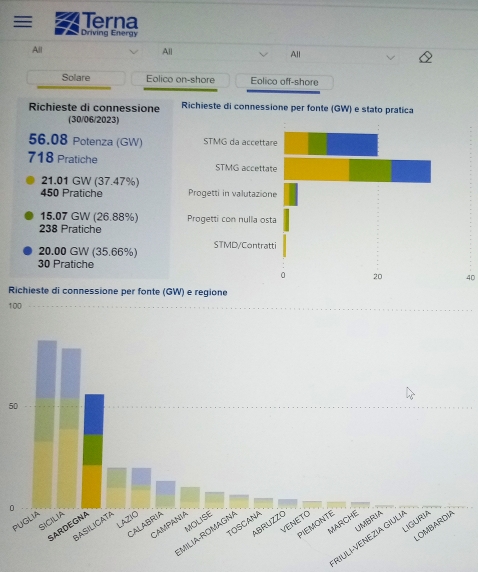 Le istanze di connessione di nuovi impianti presentate a Terna s.p.a. (gestore della rete elettrica nazionale) al 30 giugno 2023 risultavano complessivamente ben 718, pari a 56,08 GW di potenza, suddivisi in 450 richieste di impianti di produzione energetica da fonte solare per 21,01 GW (37,47%), 238 richieste di impianti di produzione energetica da fonte eolica a terra per 15,07 GW (26,88%) e 30 richieste di impianti di produzione energetica da fonte eolica a mare 20,00 GW.